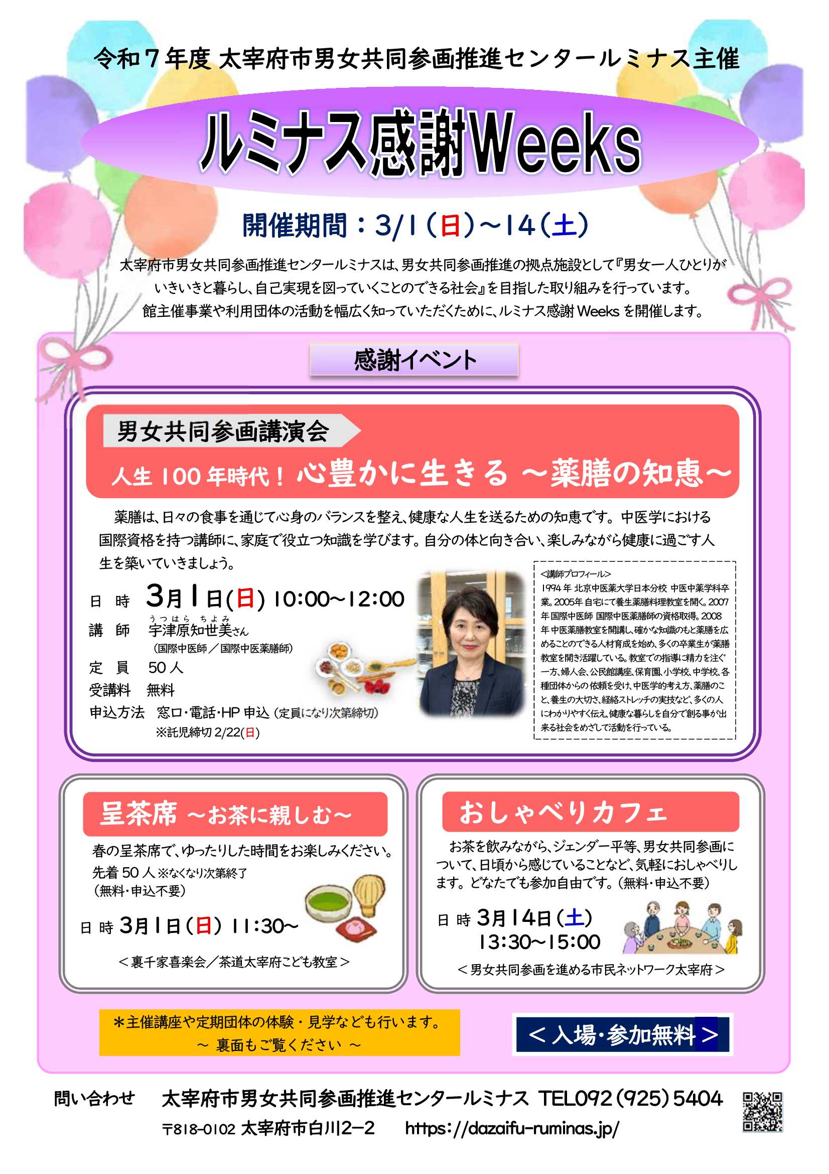【ルミナス感謝Weeks】男女共同参画講演会 「人生100年時代! 心豊かに生きる~薬膳の知恵~」「呈茶席~お茶に親しむ~」「おしゃべりカフェ」